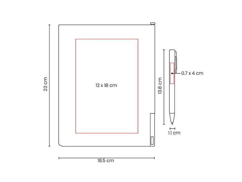 Medida: 18.5 x 23 cm Agenda / 1.1 x 13.8 cm Bolígrafo