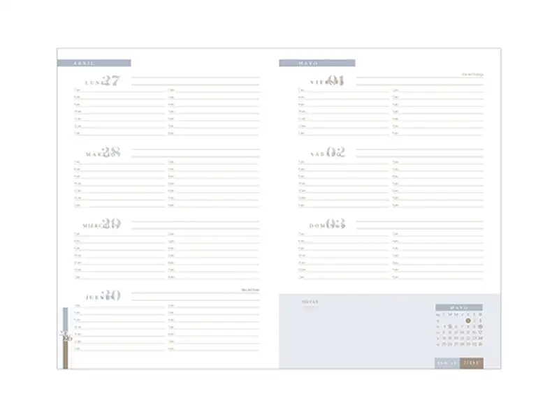 Agenda semanal con 140 hojas. Contiene datos personales, calendarios 2025-2026-2027,