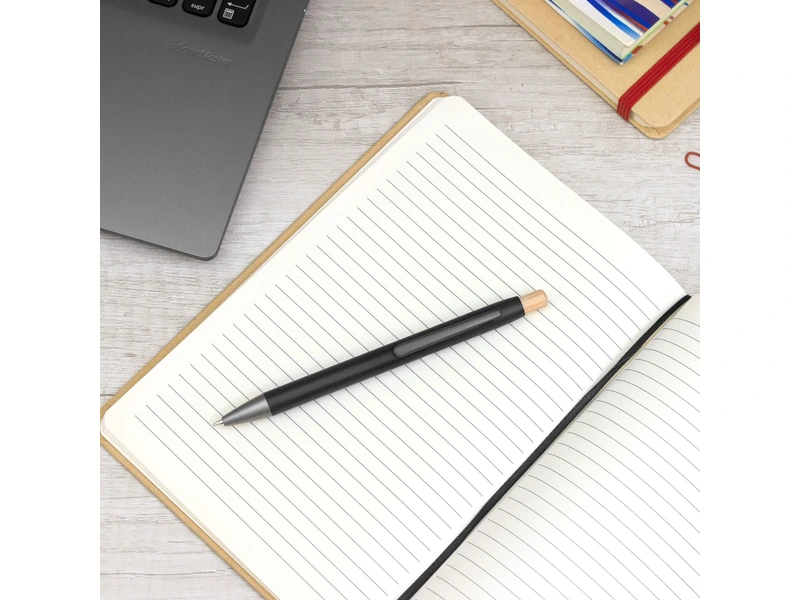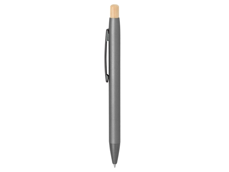 Materiales Híbridos: Elegante combinación de cuerpo de aluminio mate, puntera de ABS gris y un distintivo pulsador de bambú natural.