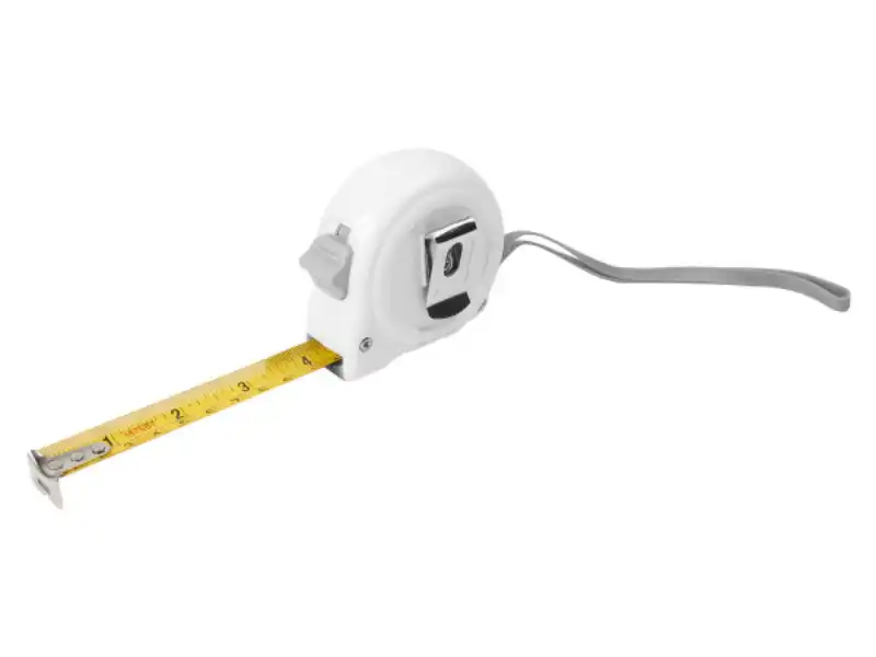 Flexómetro con cinta metálica de 5 m. Incluye correa, clip y seguro.