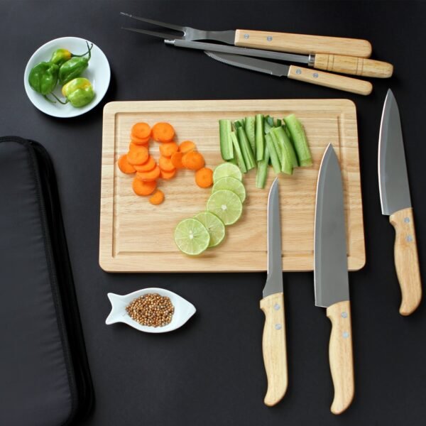 Set profesional de 7 piezas: 4 cuchillos especializados, tenedor, afilador y tabla de corte.