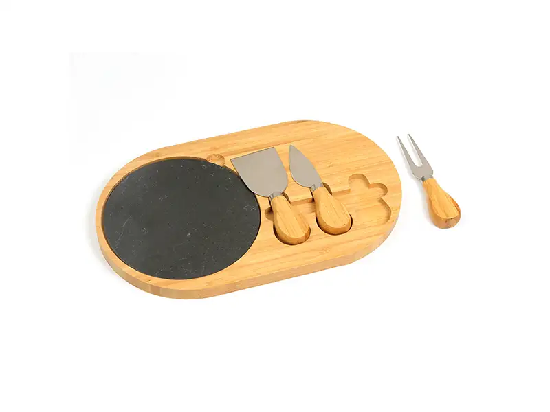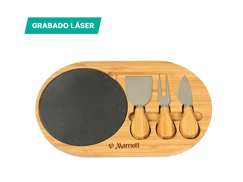 Materiales Premium: Elegante combinación de madera de bambú sustentable y tabla de corte en piedra pizarra.