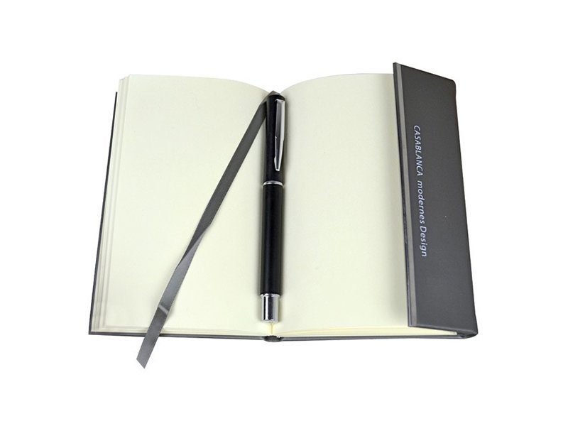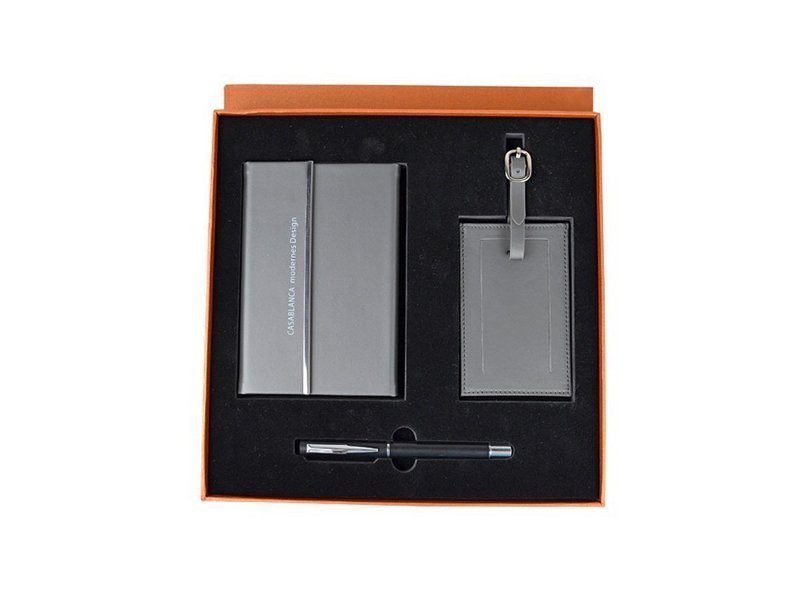 Set integral que incluye: libreta de lujo, bolígrafo metálico e identificador de maletas.