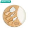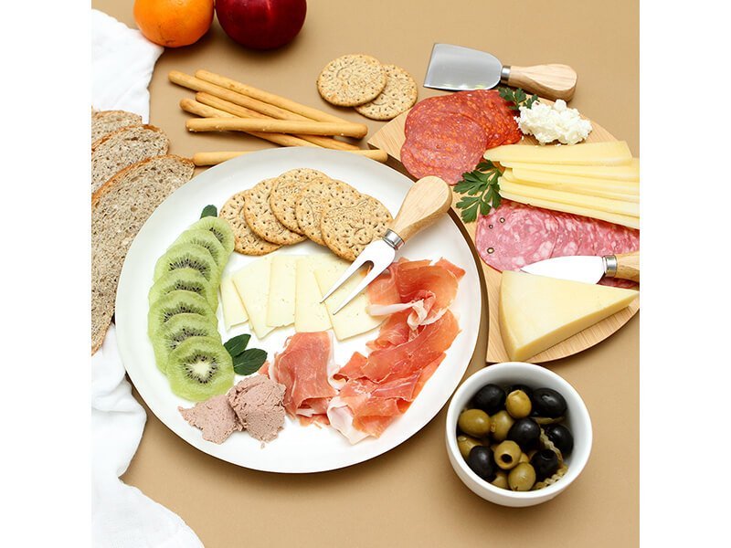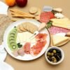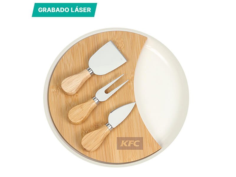 Conjunto gourmet que incluye plato de cerámica premium y tabla de bambú natural.