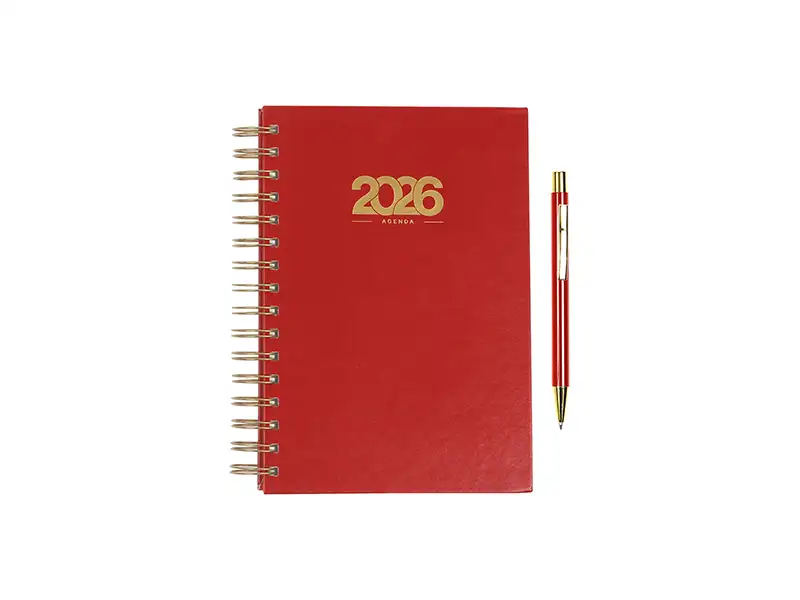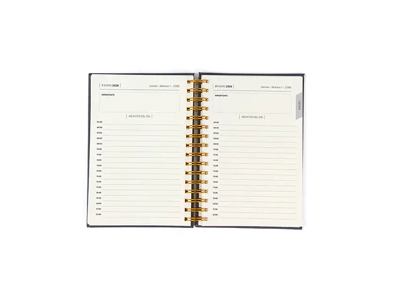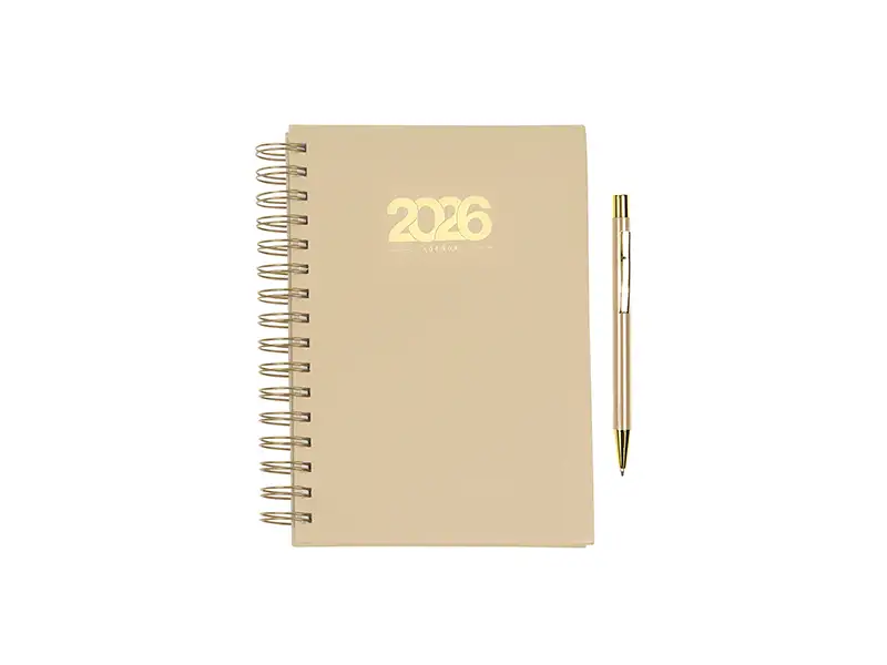 Set de Agenda diaria 2026 con espiral, detalles en dorado, pluma y caja de regalo.
