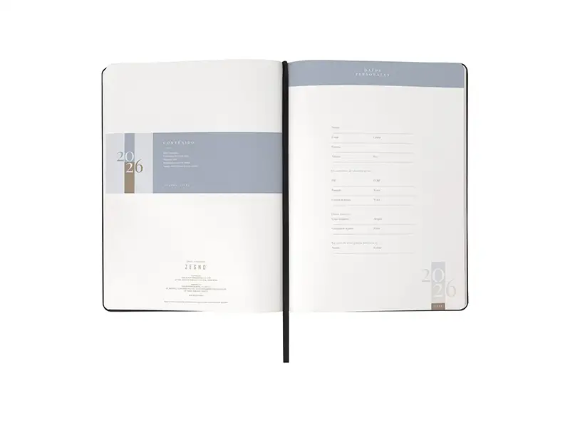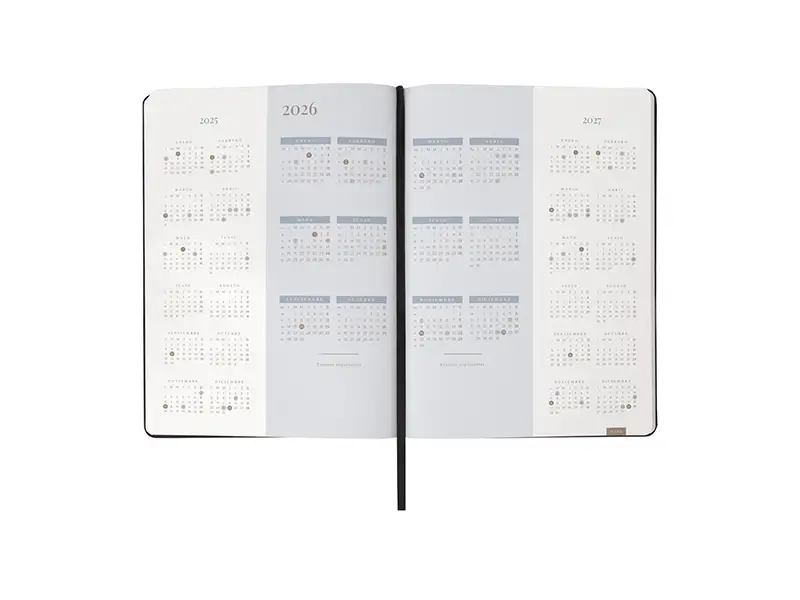 Agenda diaria con 174 hojas. Contiene datos personales, calendarios 2025-2026-2027,