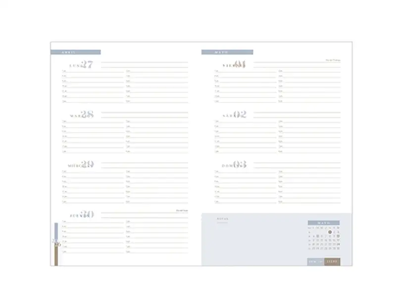 Agenda semanal con 100 hojas. Contiene datos personales, calendarios 2025-2026-2027,