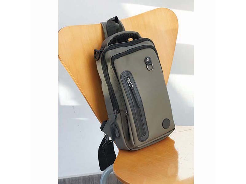 • Bolsillo frontal con zipper, detalle de argolla y etiqueta de personalización.