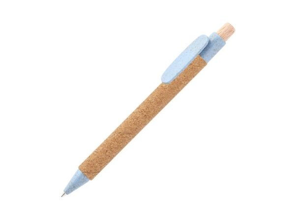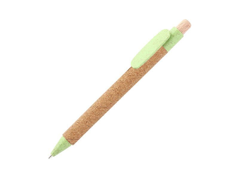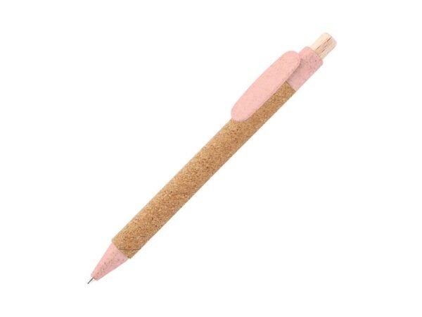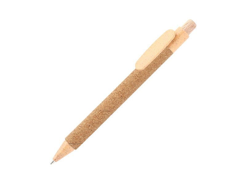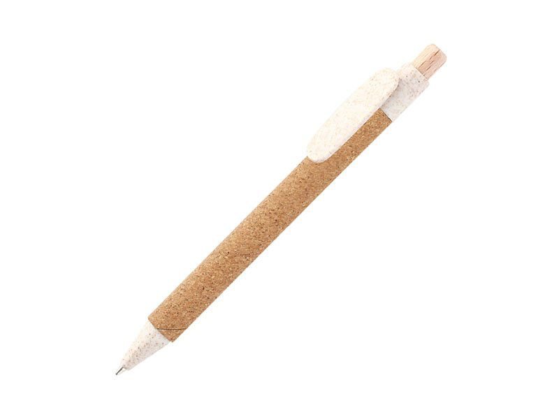 Bolígrafo retráctil fabricado en corcho, clip en fibra de trigo y botón de madera.
