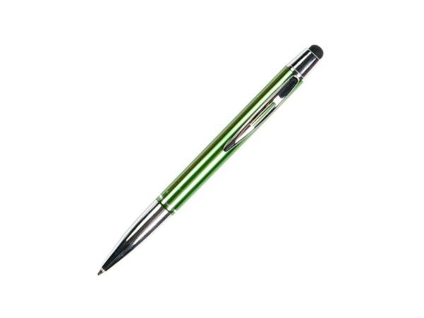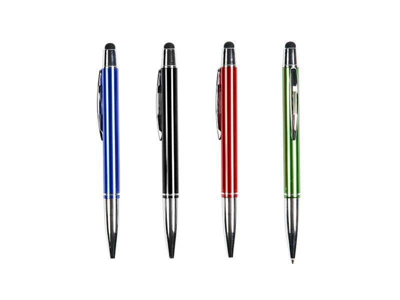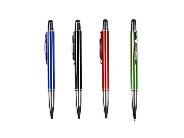 Bolígrafo metálico con puntero touch, clip, punta y detalles cromados. Tinta de escritura negra.
