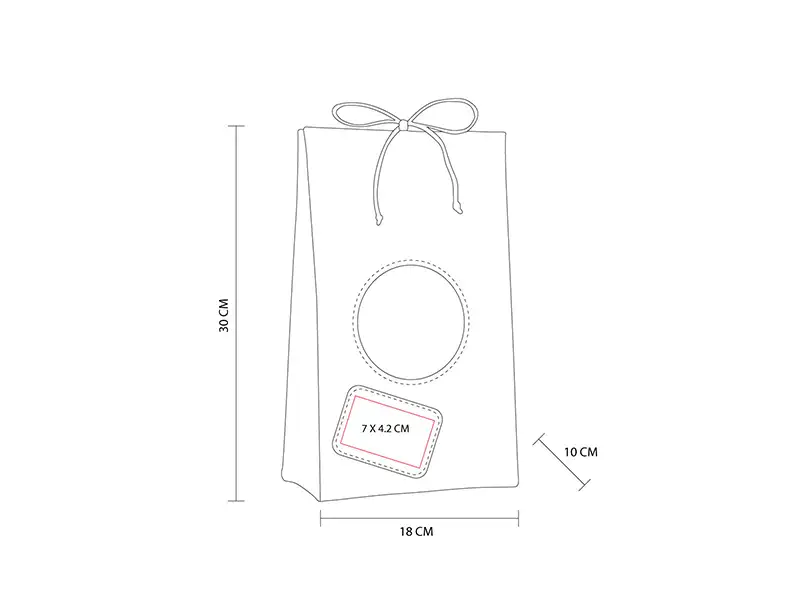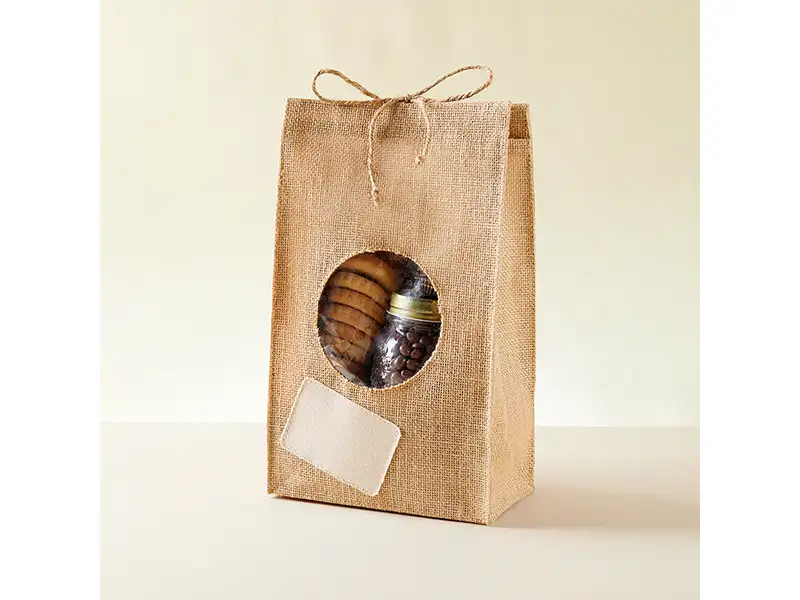 Bolsa Ciro de yute laminada. Cierre de cordón. Ventana de PCV y parche de algodón