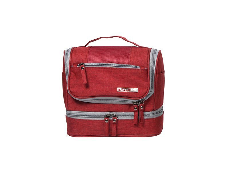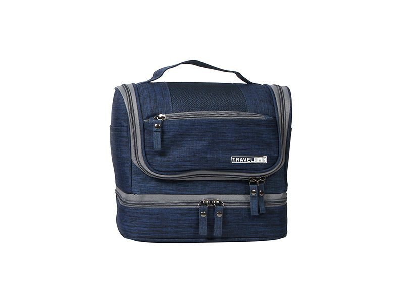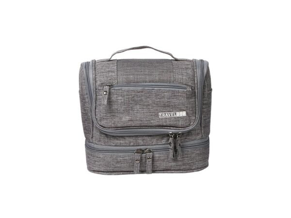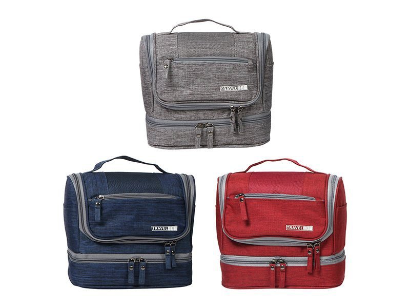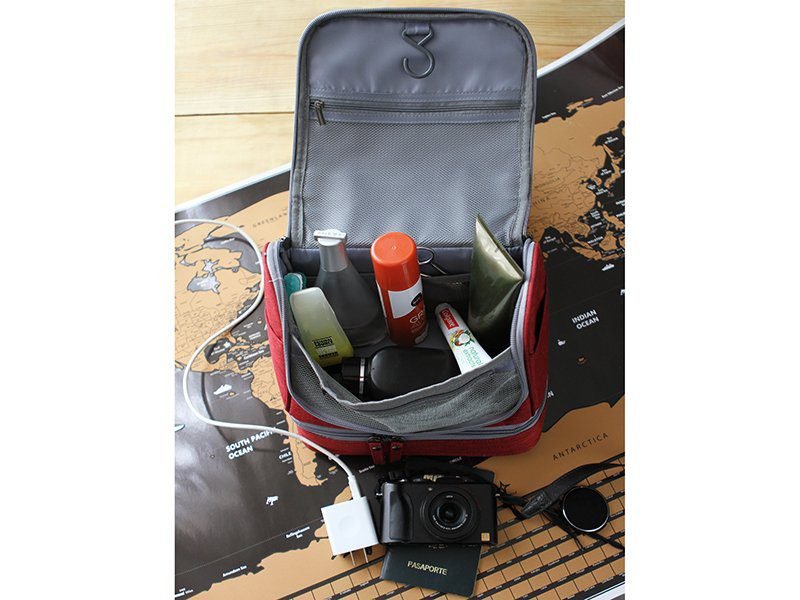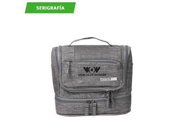 Bolsa multiusos doble fabricada en poliéster desplegable con compartimentos y gancho.