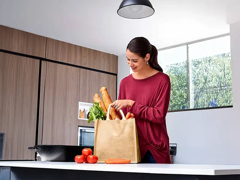 Bolsa con fuelle y asas redondeadas. Interior plastificado. El yute es un producto