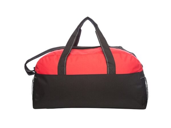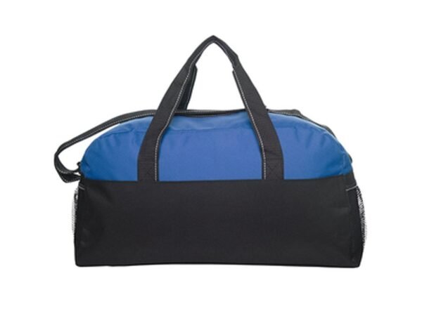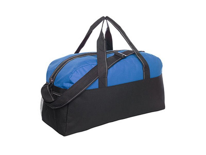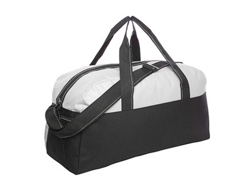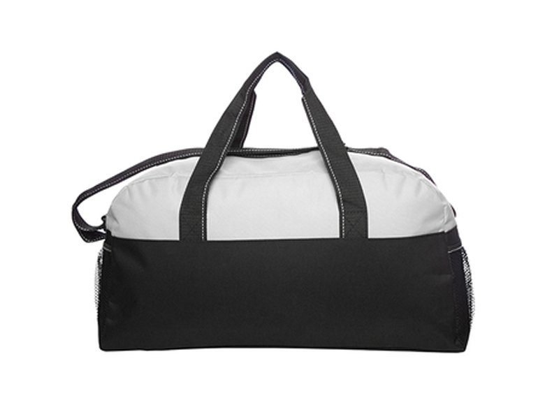 Bolso con bolsillos de redes en los laterales. Dos manijas, correa y cierre principal con vivos blancos.