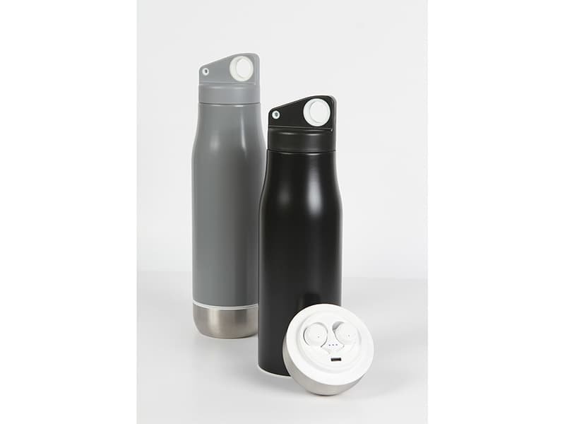 • Detalle funcional con compartimento inferior y audífonos Bluetooth incluidos
