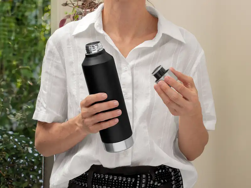 • Calidad de Materiales: Interior en acero 304 y exterior en acero 201 con tapa a rosca de silicona antiderrame.