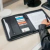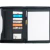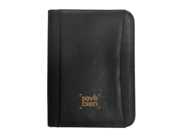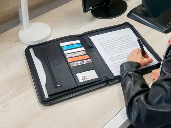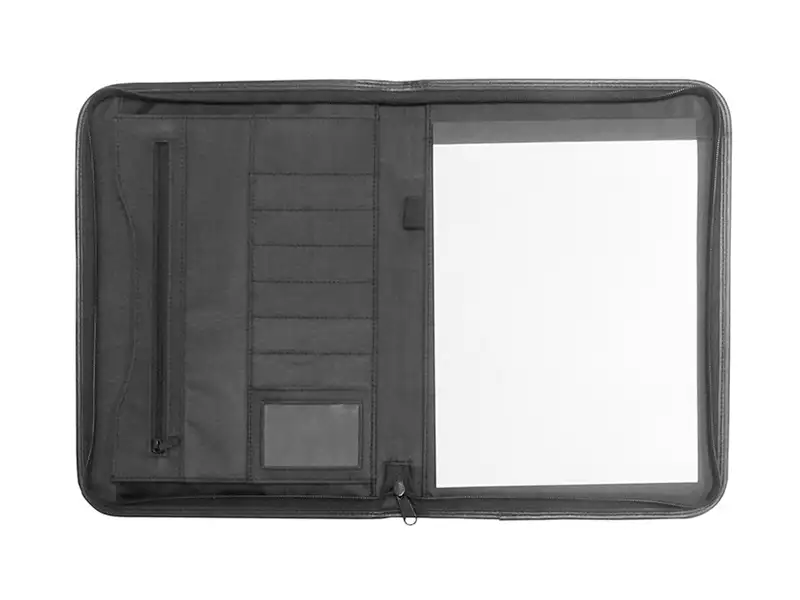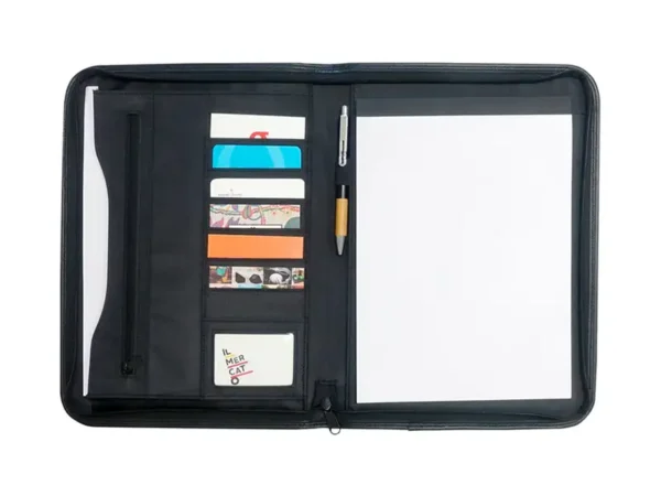 Carpeta con cierre. Contiene 1 bloc de 20 hojas lisas tamaño A4. Porta bolígrafo. Bolsillo externo. Compartimentos internos para 7 tarjetas. Sobre con fuelle y bolsillo interno con cierre. Diseñada con materiales que poseen algunos beneficios ambientales sobre el cuero genuino, ya que no requiere de animales para su fabricación y además, no necesita ser químicamente curtido.