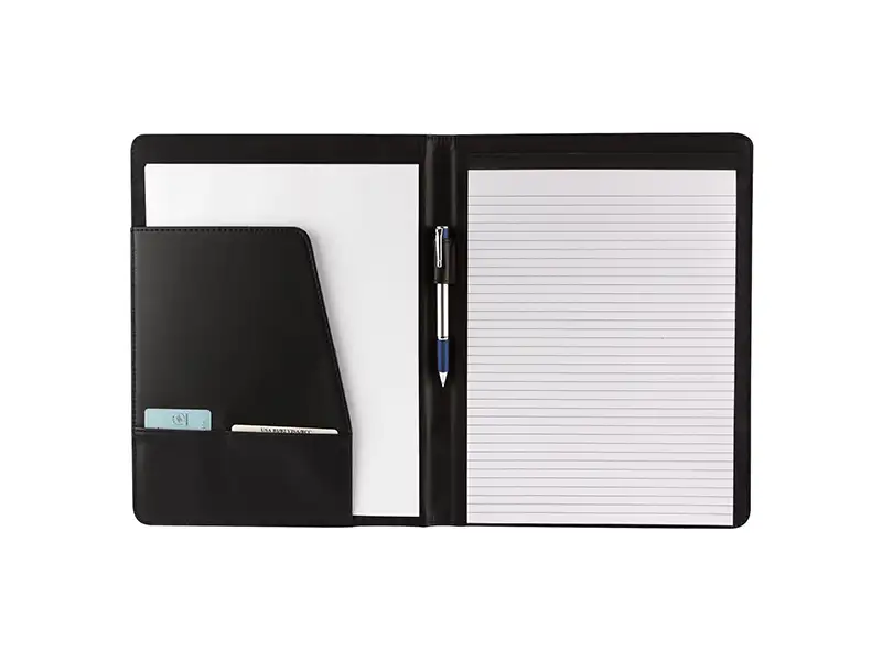 • Organizador Interno: Compartimentos integrados para tarjetas de presentación y sujetador de bolígrafo (no incluido).