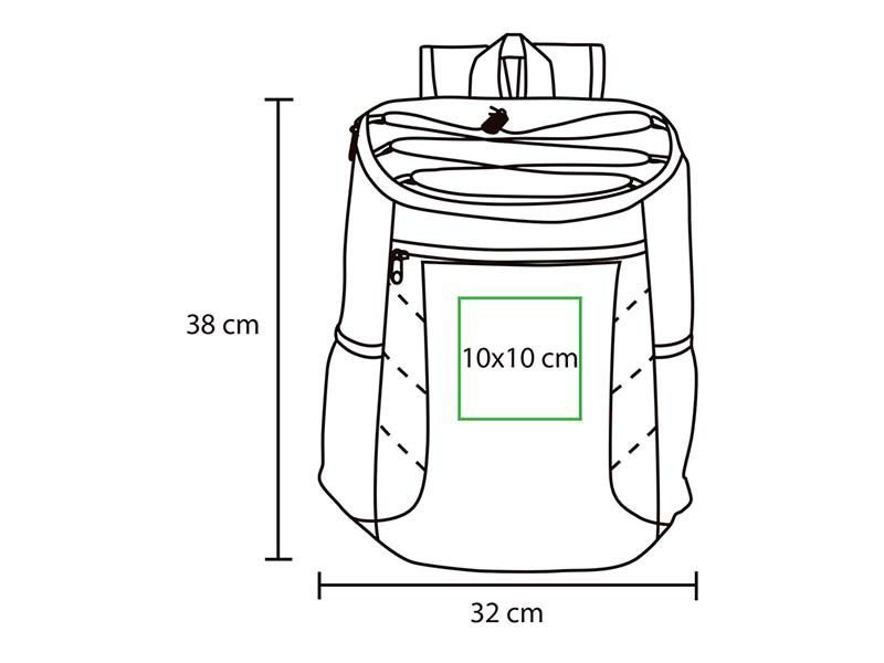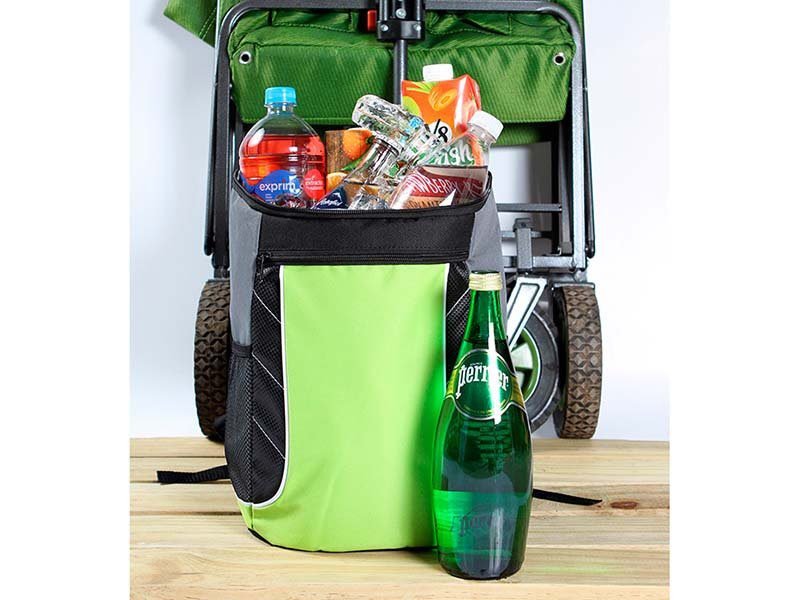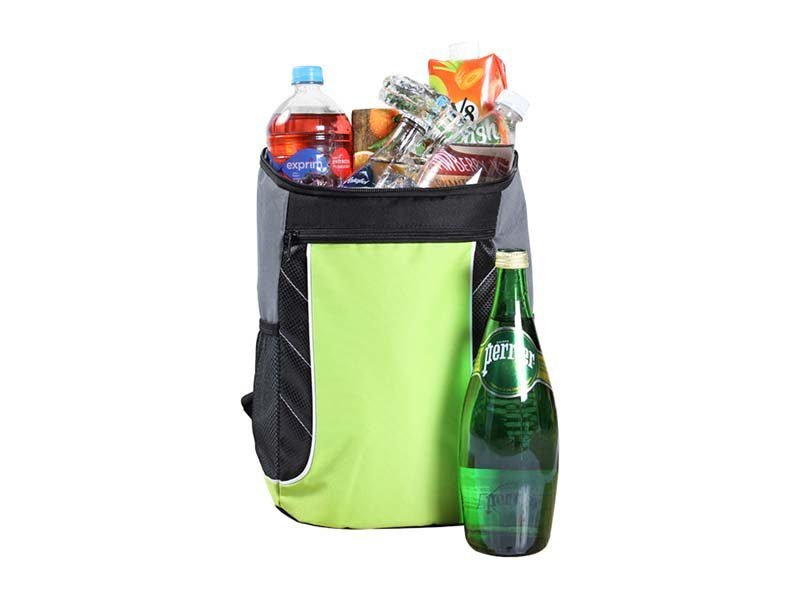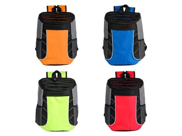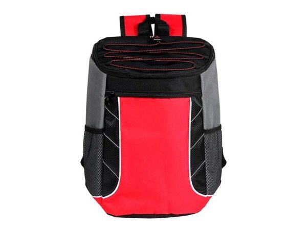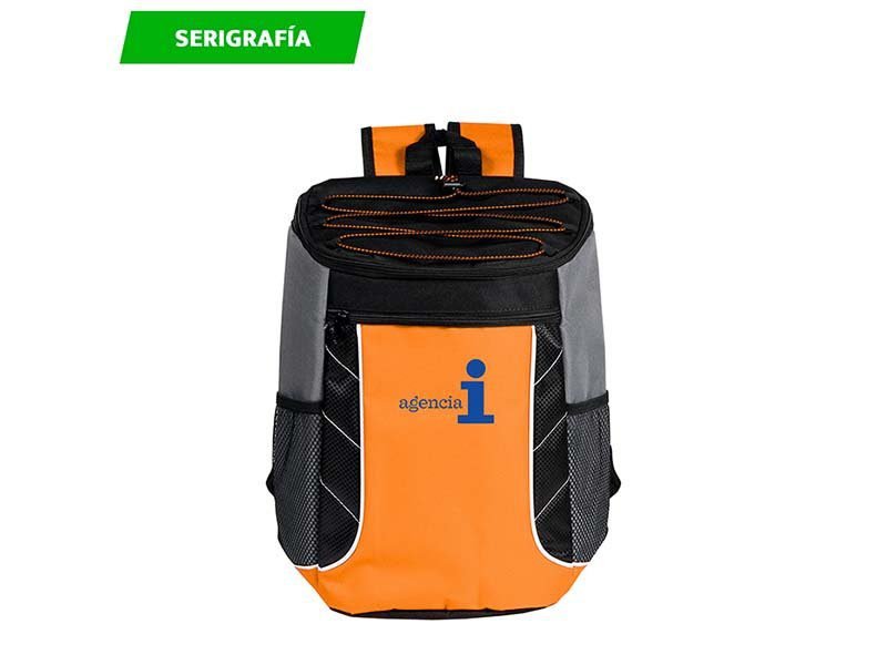 Hielera backpack fabricada en poliéster con tensores y bolsas tipo red a los costados.