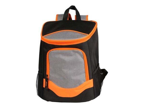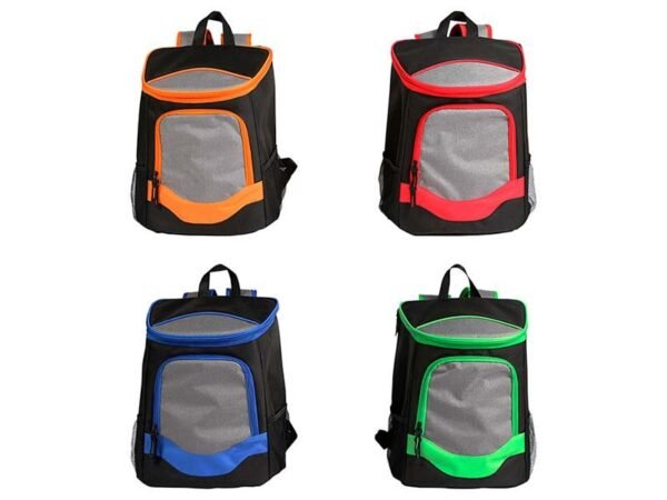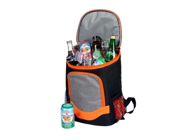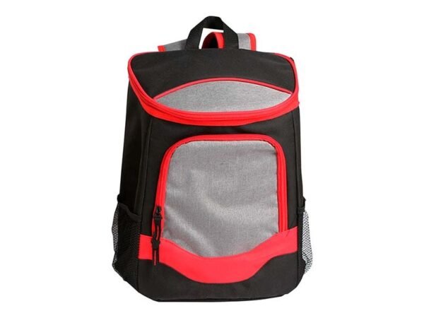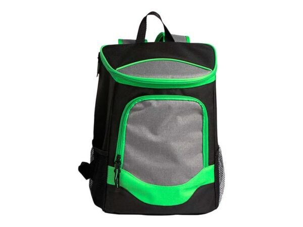 Hielera backpack fabricada en poliéster con bolsas tipo red a los costados.