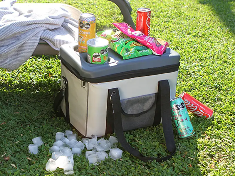 Hielera Maucini para alimentos fabricada en poliéster, nylon y eva. Cuenta con destapador