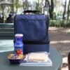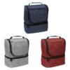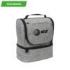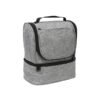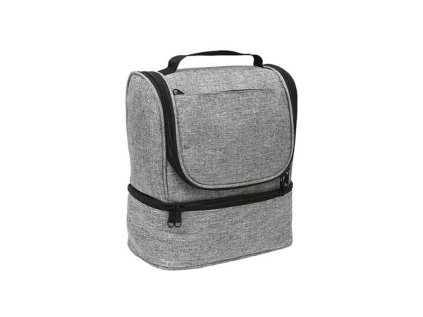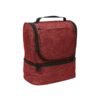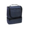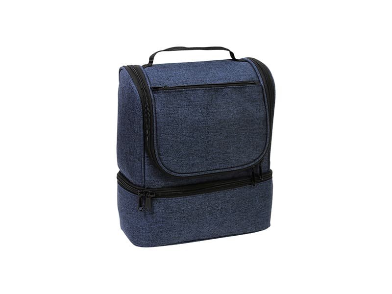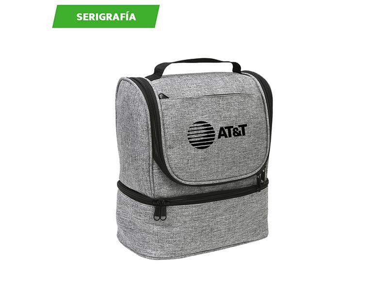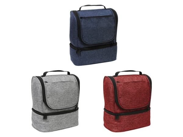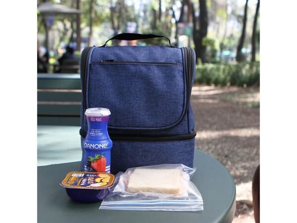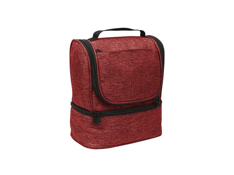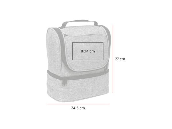 Hielera fabricada en poliéster, con compartimento inferior y bolsillo frontal.