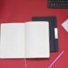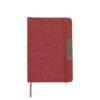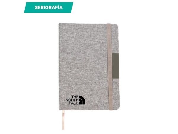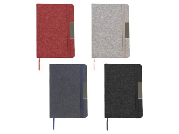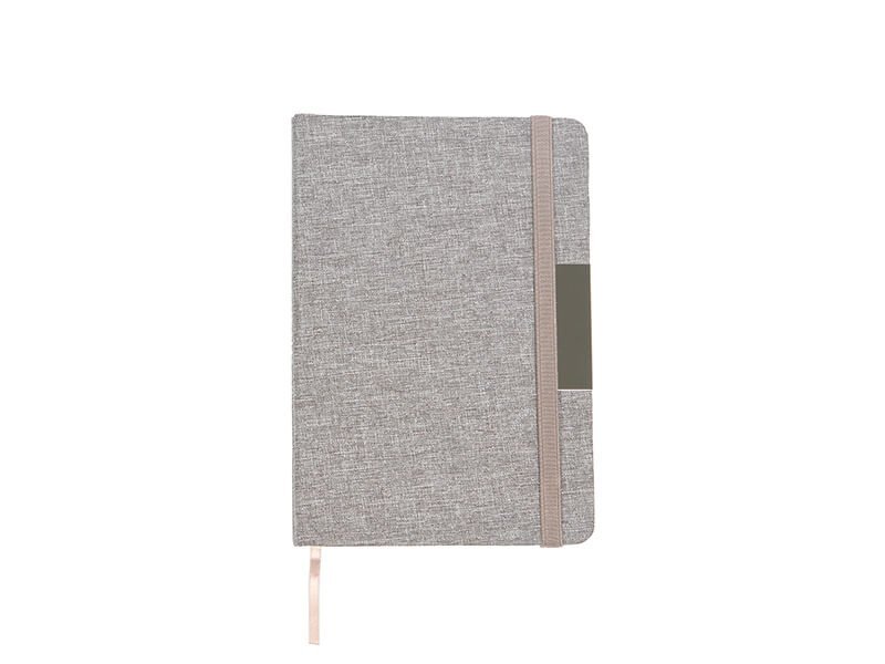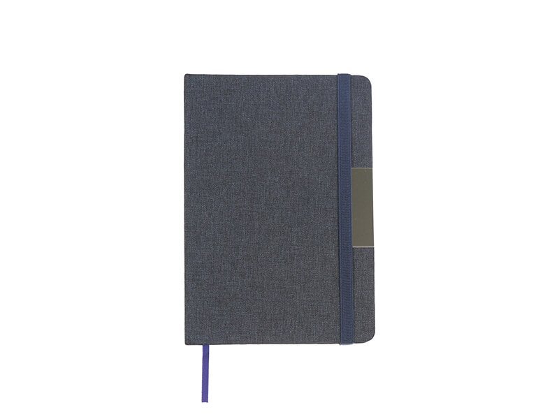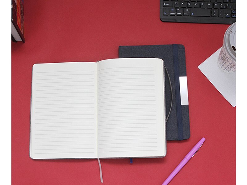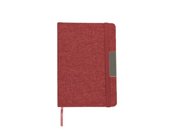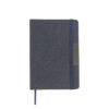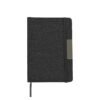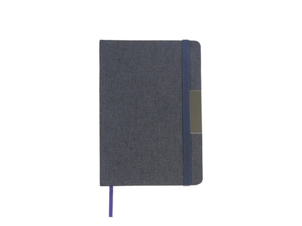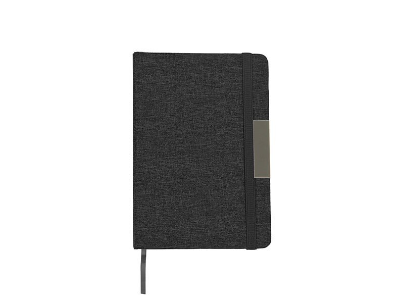 Libreta con pasta rígida de poliéster reciclado, con banda elástica y placa metálica.