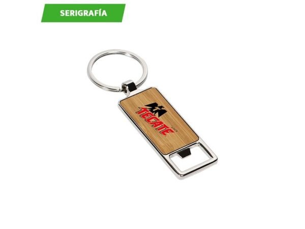 Llavero rectangular con placa de bamboo, destapador y detalles niquelados.
