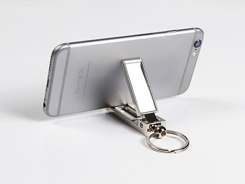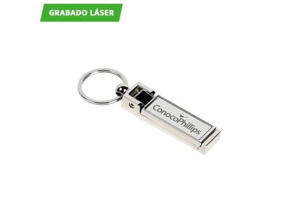 Llavero metálico multifunciones con cuelga bolsa y porta celular.