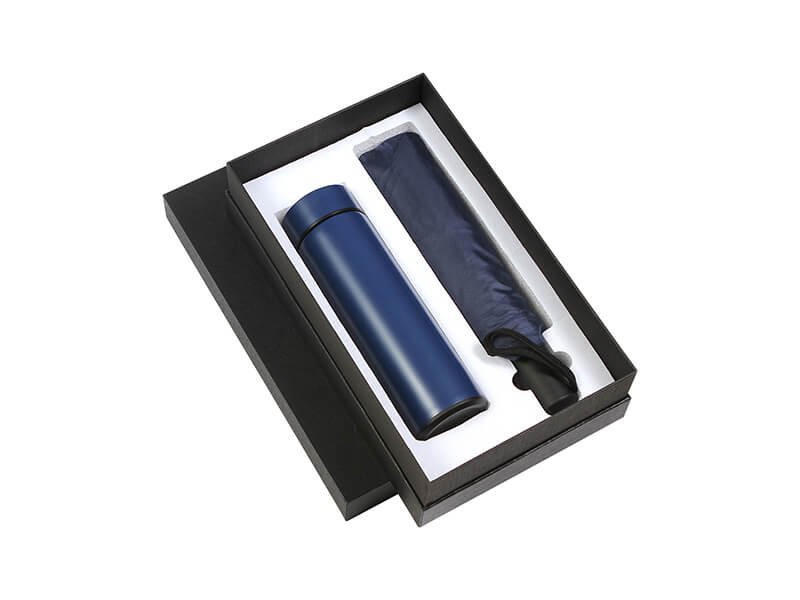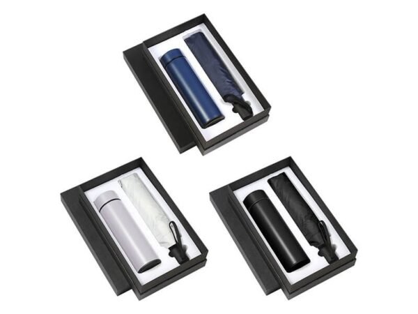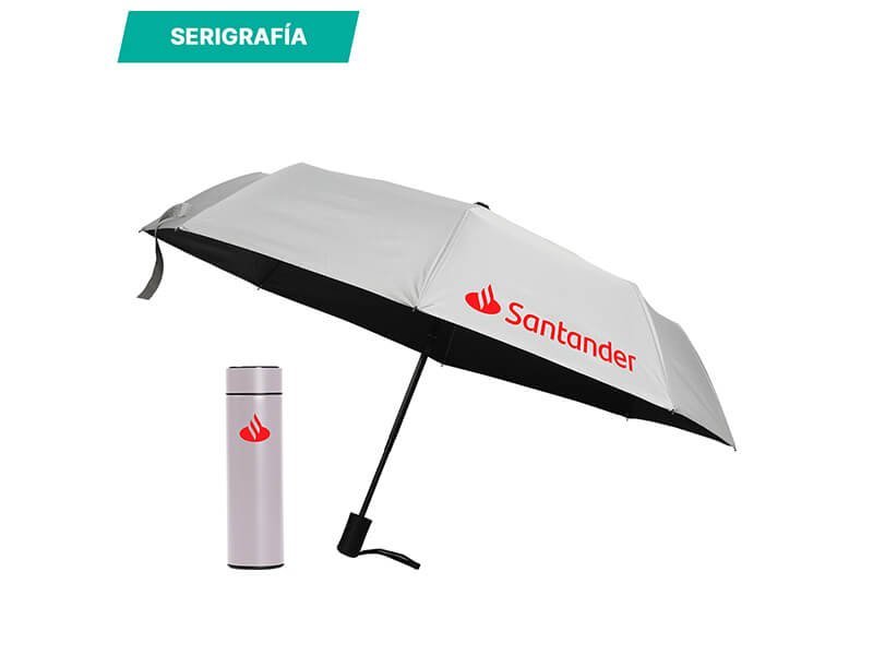 Medidas: Paraguas: 28×6 cm (cerrado), 54×84 cm (abierto); Termo: 6.5×23 cm.