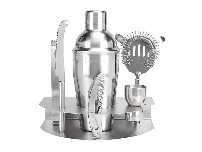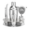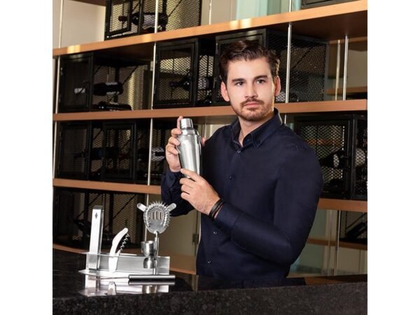 SET SKOPJE (Set para preparación de bebidas con base. Incluye shaker, pinzas, sacacorchos, dosificador, colador y cuchillo.)