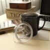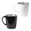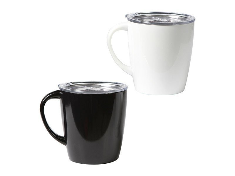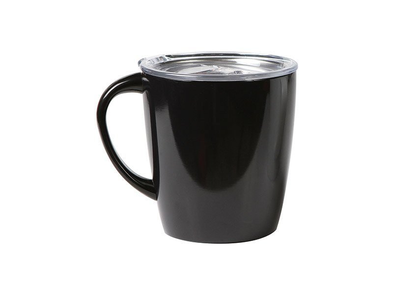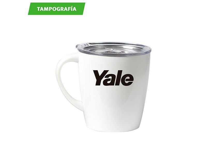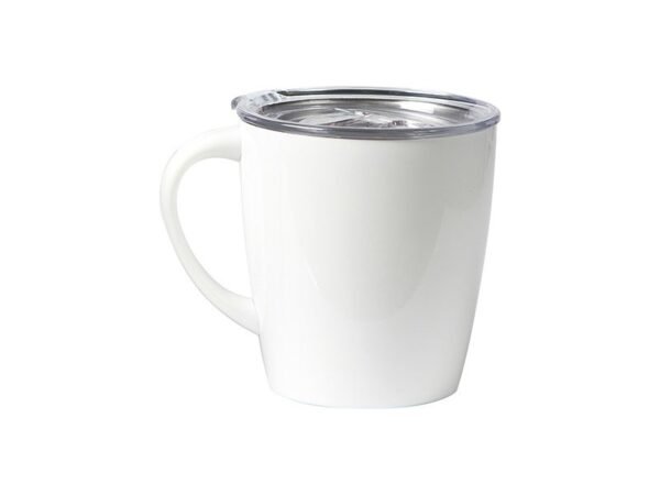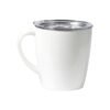 Taza de acero inoxidable doble pared con tapa de plástico transparente, capacidad 350 ml.