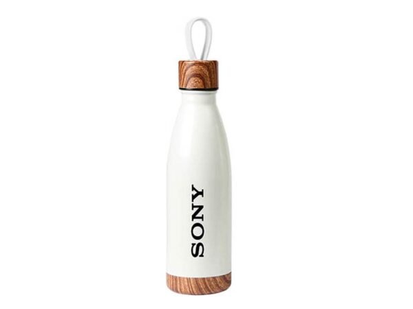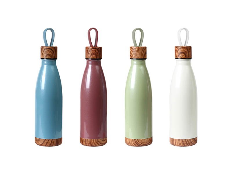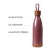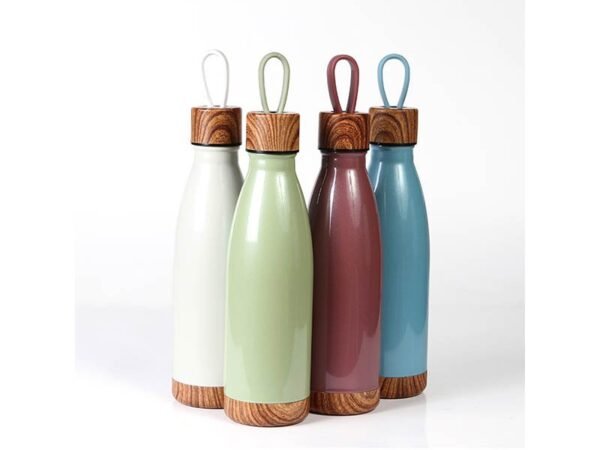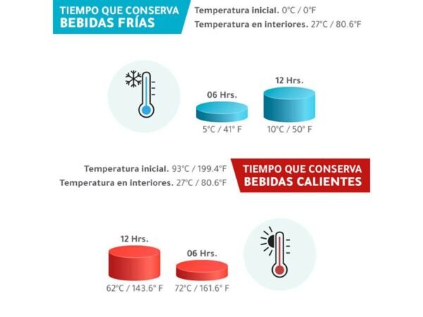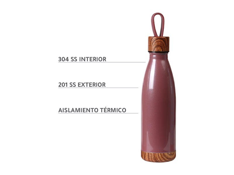 Termo de acero inoxidable doble pared, con correa de tpr, tapa de rosca y detalles apariencia madera, fabricado en materiales de grado alimenticio, mantiene bebidas frías o calientes por un largo tiempo, no usar en microondas, incluye caja de cartón individual.