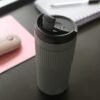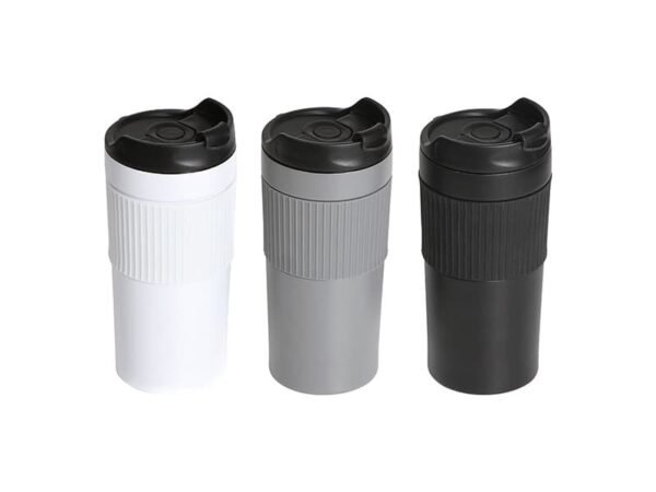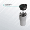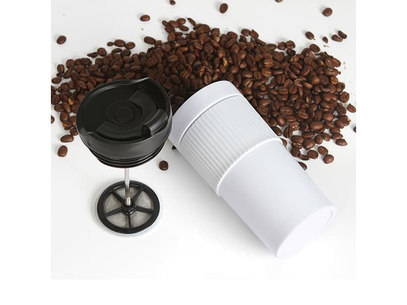 Termo de doble pared de acero inoxidable con manga de silicon, prensa francesa de acero inoxidable, tapa hermética anti derrame con cubierta de seguridad, fabricado en materiales de grado alimenticio, mantiene bebidas calientes por un largo tiempo, no usar en microondas. Capacidad de 480 ml. Incluye caja de cartón individual.