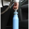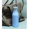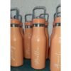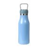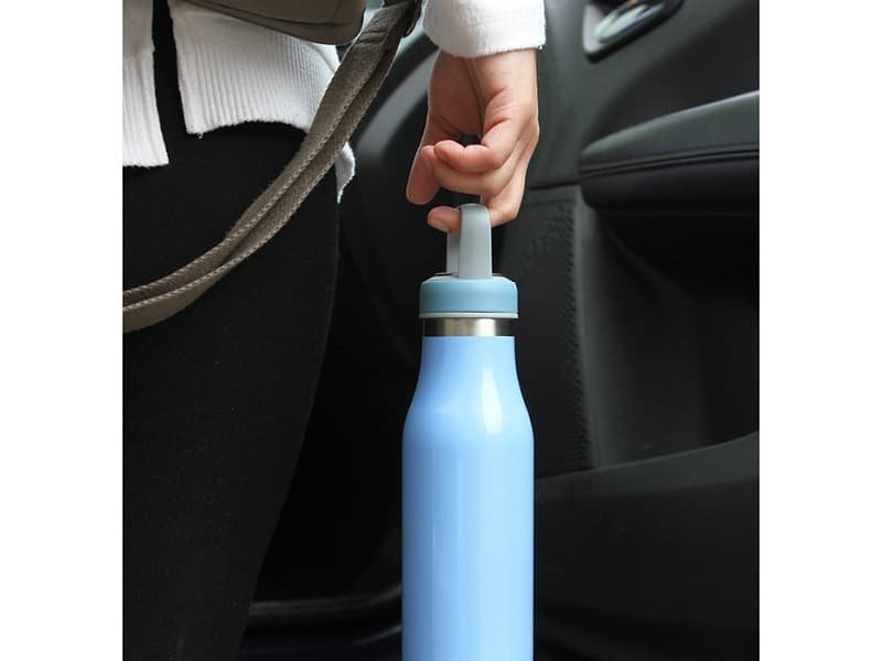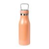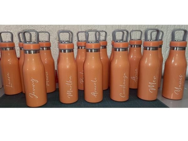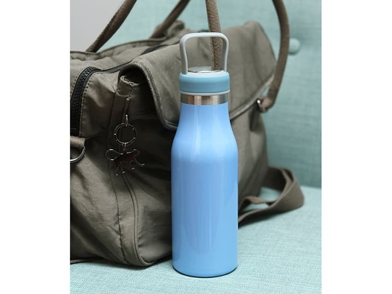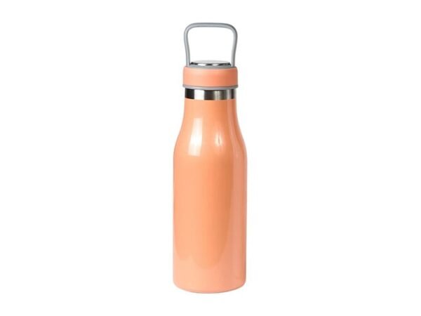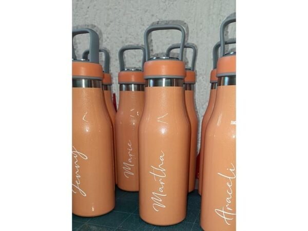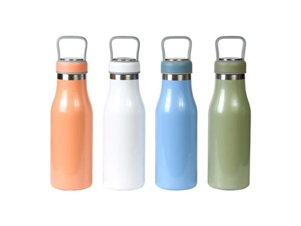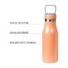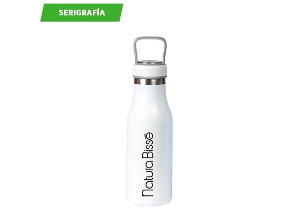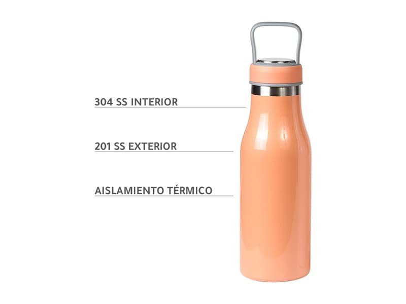 Termo de acero inoxidable doble pared con asa de plástico y detalles metálicos, fabricado en materiales de grado alimenticio,
