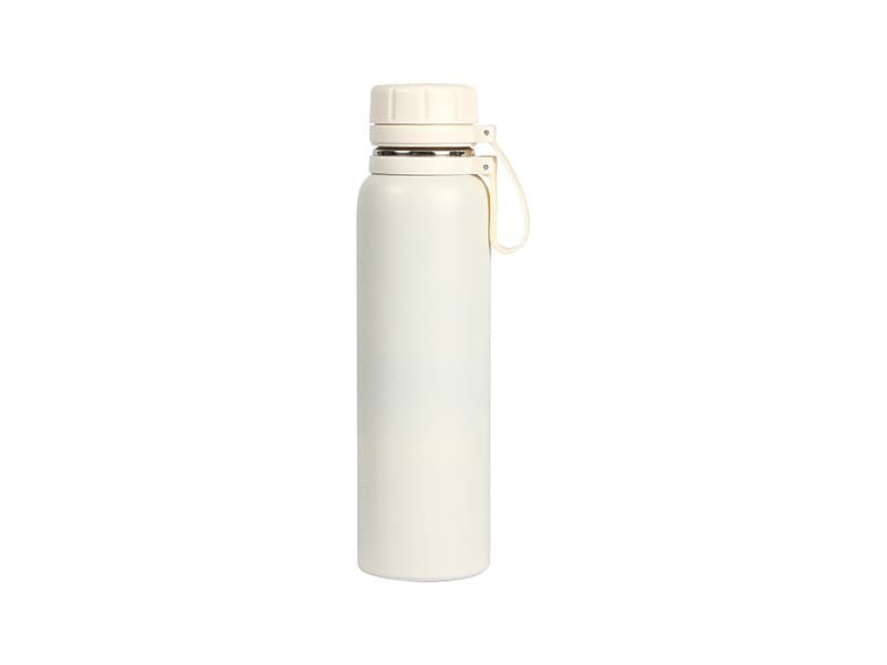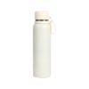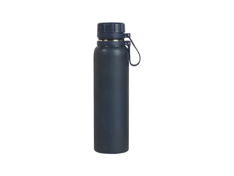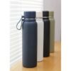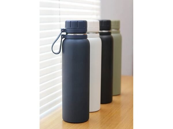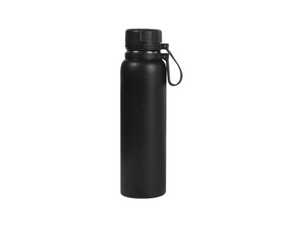 Termo de acero inoxidable doble pared acabado brillante, con tapa de plástico y correa de silicón. Fabricado en materiales de grado alimenticio, mantiene bebidas frías o calientes por un largo tiempo. No usar en microondas. Capacidad de 850 ml. Incluye caja de cartón individual.