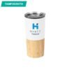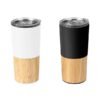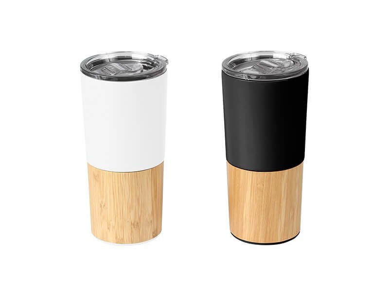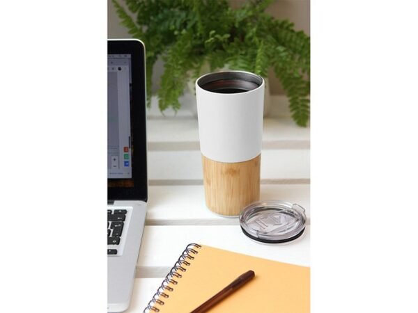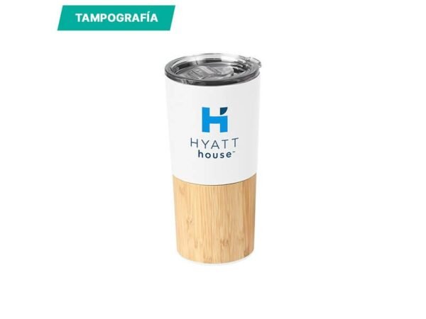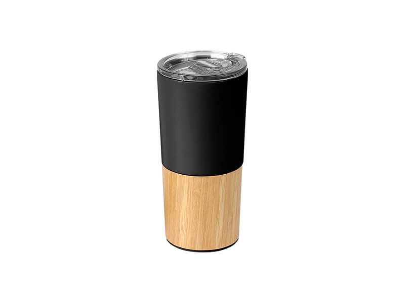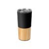 Termo de acero inoxidable doble pared con detalle en bambú, tapa plástica deslizable,