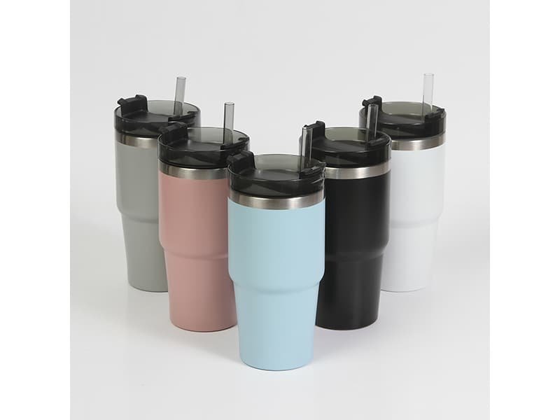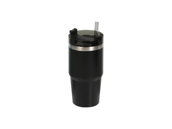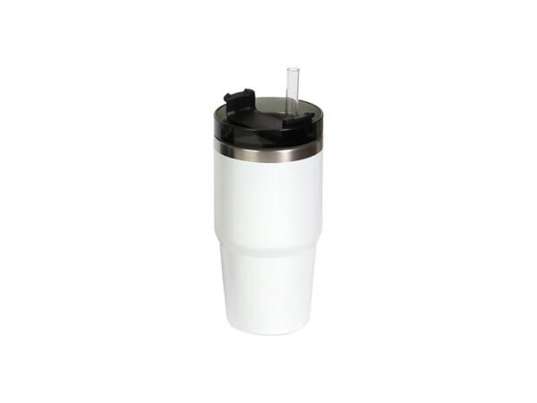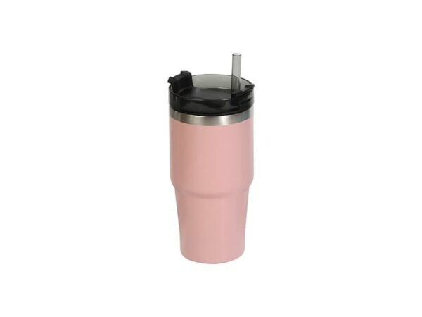 Vaso de acero inoxidable doble pared con tapa y popote de plástico, fabricado en materiales de grado alimenticio, mantiene bebidas frías o calientes por un largo tiempo. No usar en microondas, capacidad de 600 ml. Incluye caja de cartón individual.