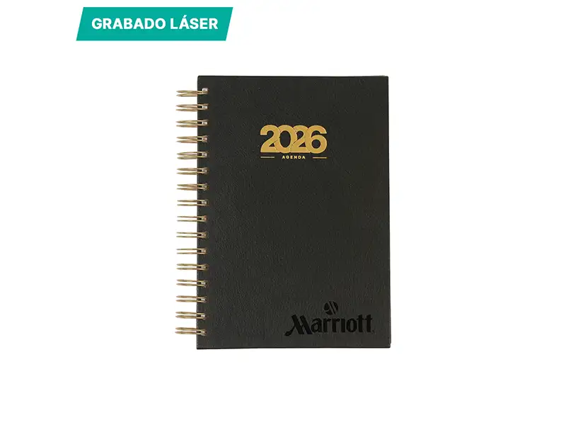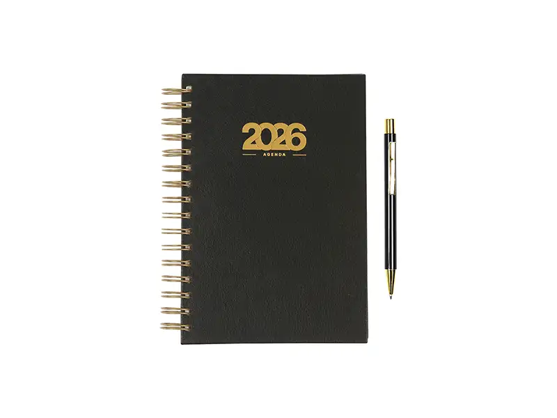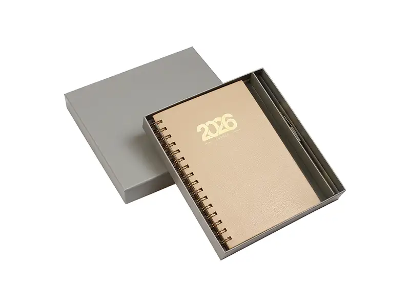 Set de Agenda diaria 2026 con espiral, detalles en dorado, pluma y caja de regalo.