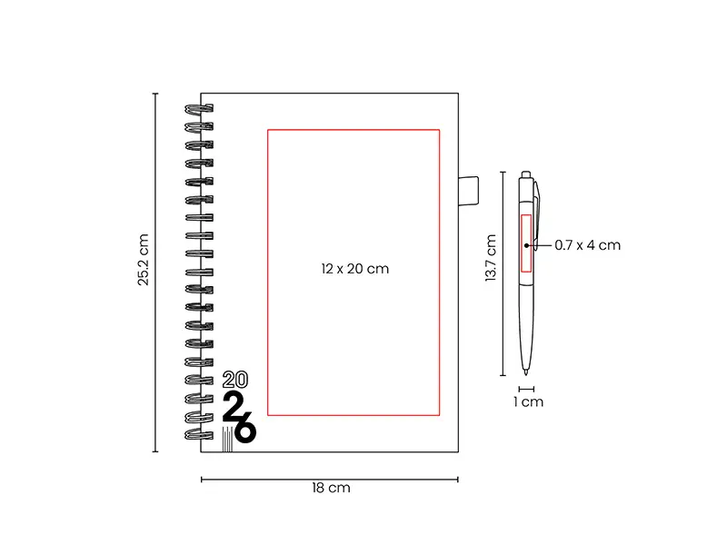 Medida: 18 x 25.2 cm Agenda / 1 x 13.7 cm Bolígrafo