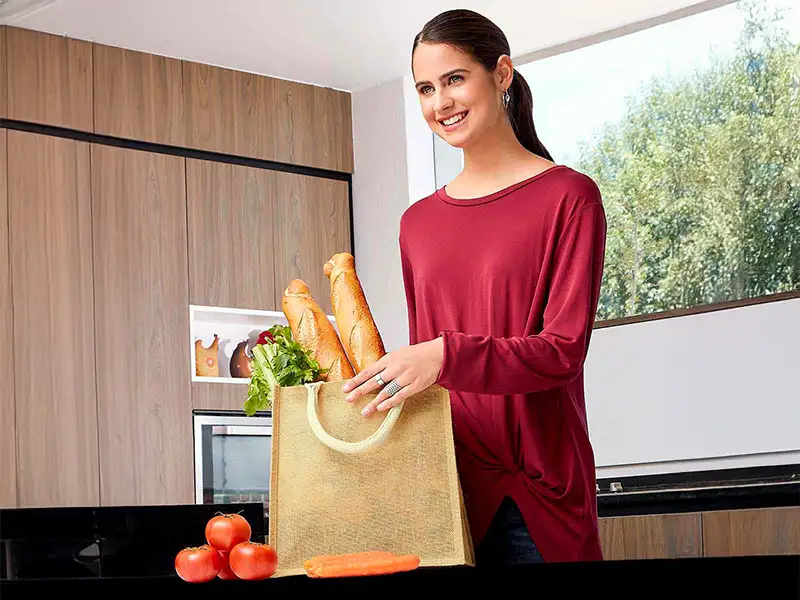 Bolsa con fuelle y asas redondeadas. Interior plastificado. El yute es un producto
